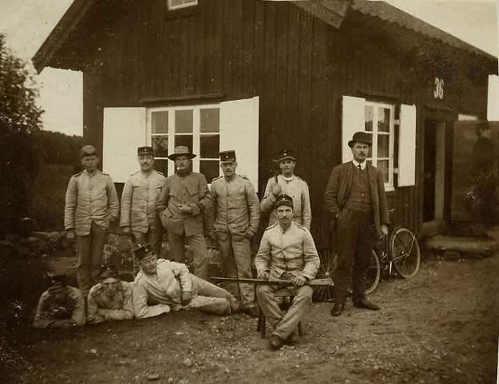 Enligt Bengt Lundins noteringar:"Folk vid gevärssmidjan. (byggnad 36)".