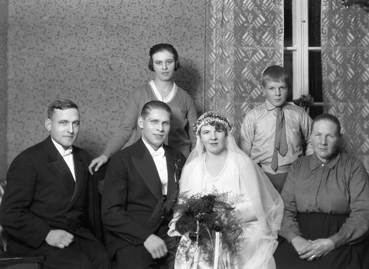 Uppgift enligt fotografen: "Uddevalla. Gruppfoto bröllop. Hans Karlsson, Hemmiljö."