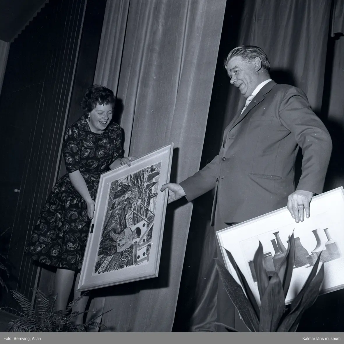 Gärdslösa, invigning av I.O.G.T-gården. Kvinna och man som håller i tavlor på en scen.