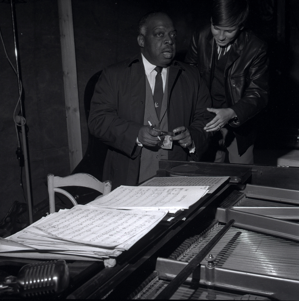 Count Basie och en person vid ett piano, verkar som att CB signerar en sedel.