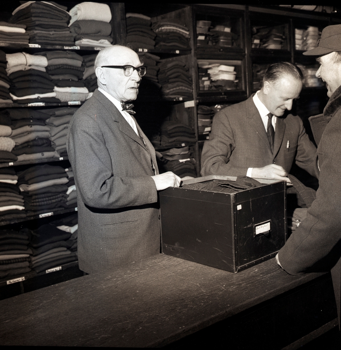 Grosshandlare Karl Danielsson bakom disken expedierar sina kunder tillsammans med Torsten Lundin dagen innan nyårsafton. Danielsson fyllde åttio år vid fototillfället.