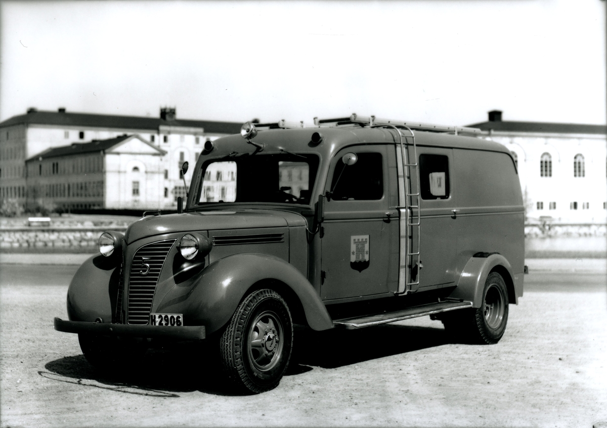 Rökdykarbil framför brandstationen med Stagneliusskolan i fonden.