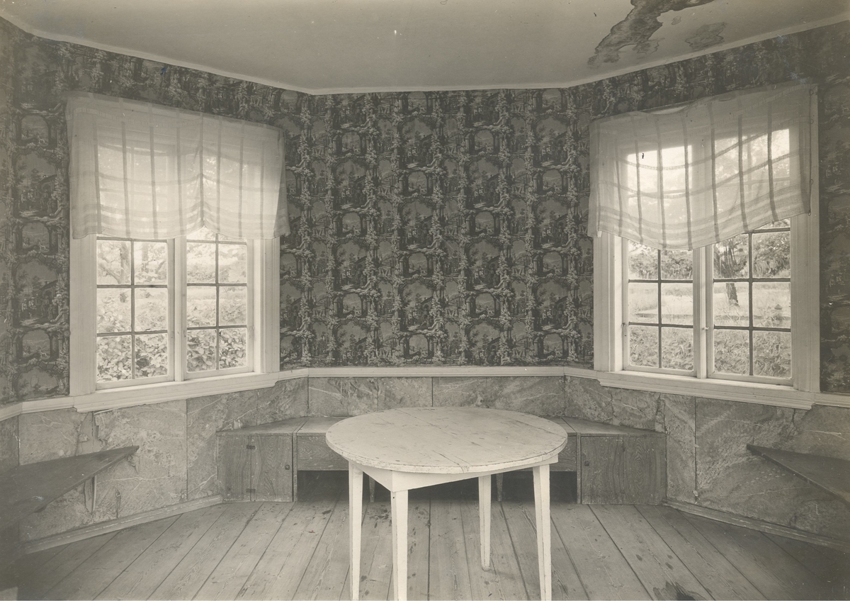 Bruatorps gård. Parken. Interiör av lusthuset. Tryckt tapet från 1800-talets mitt. Marmorerad panel.