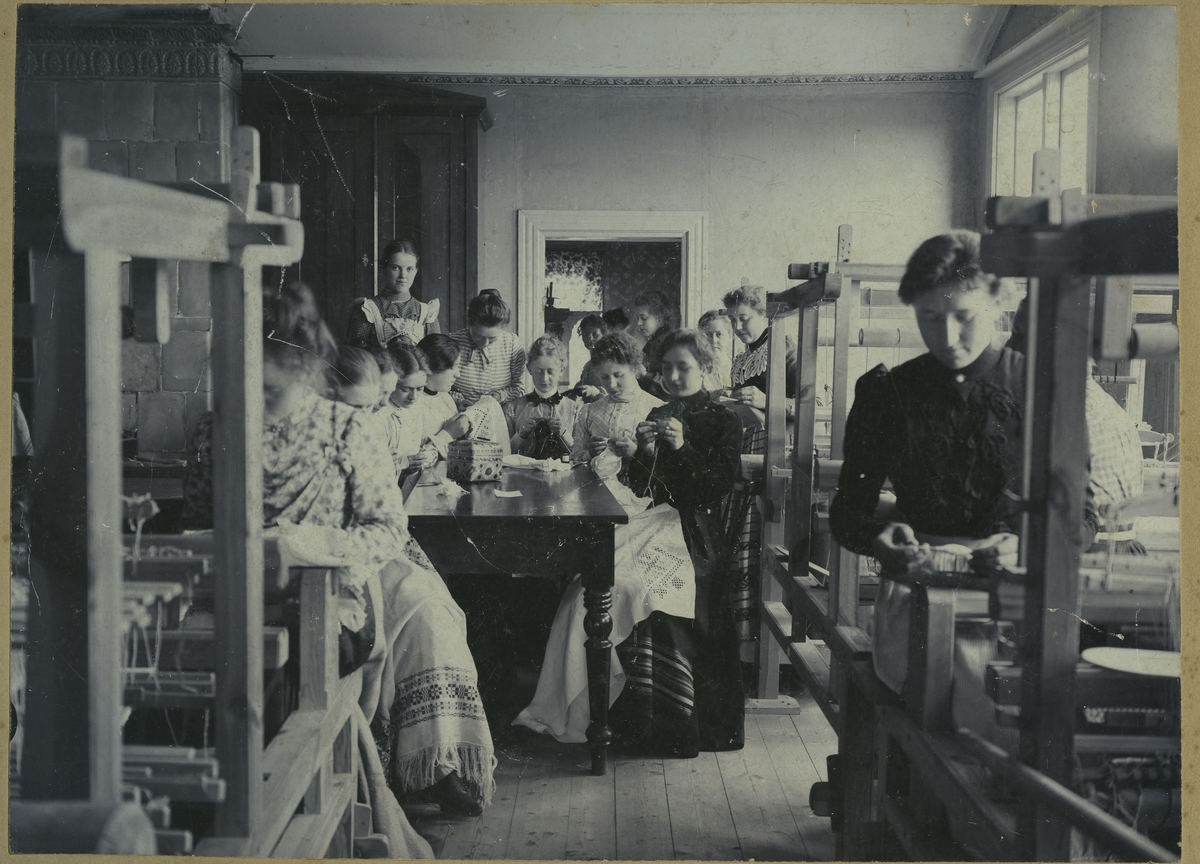Textilslöjd. Unga kvinnor som väver och syr. Eventuellt skola.
