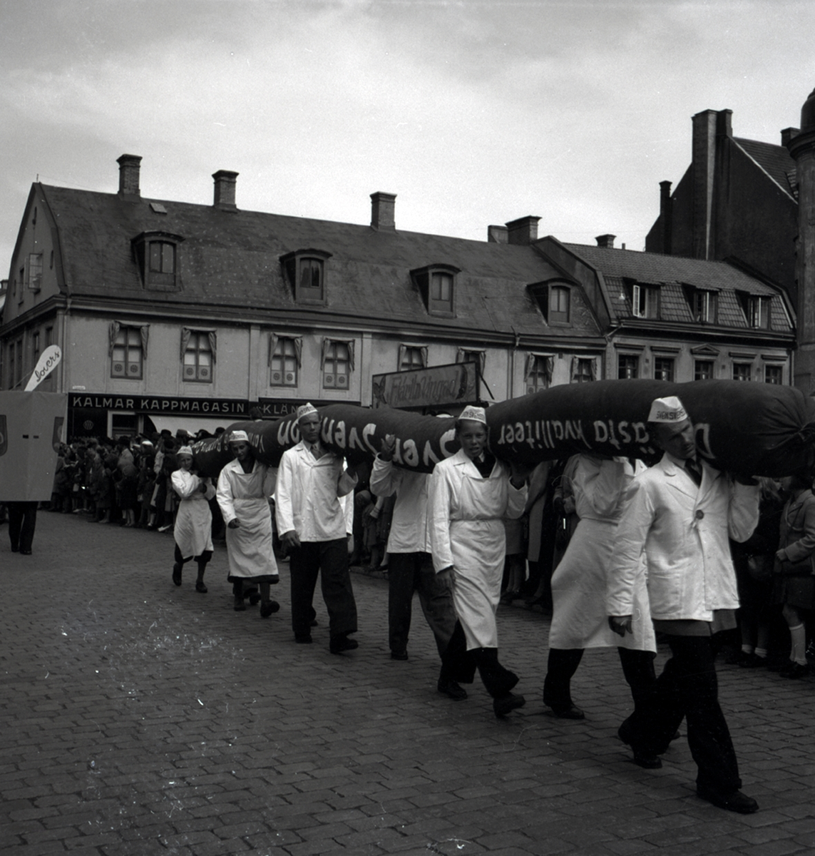Charkuterister i Kalmar bär korv i reklamsyfte.