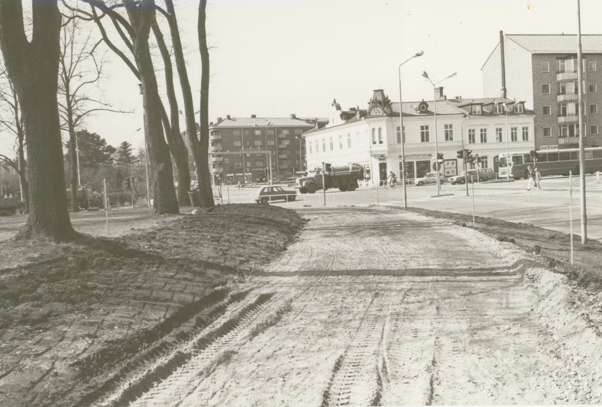 Anläggning av cykelbana på Tullslätten, kanten av parken Dryaden. I bakgrunden syns trafikljusen och Sporthörnan.