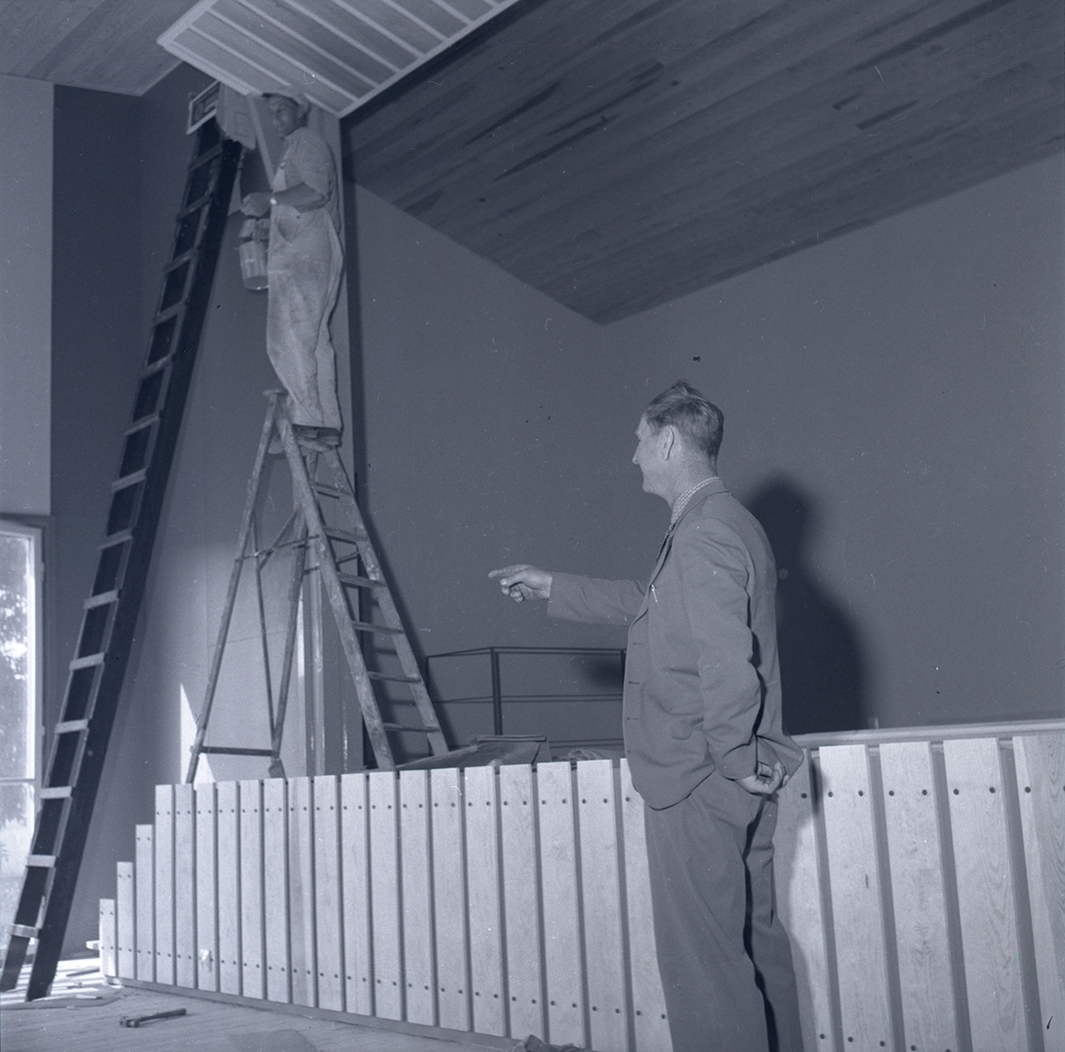 En målare och en man i kostym i hembygdsgården i Köpingsvik.