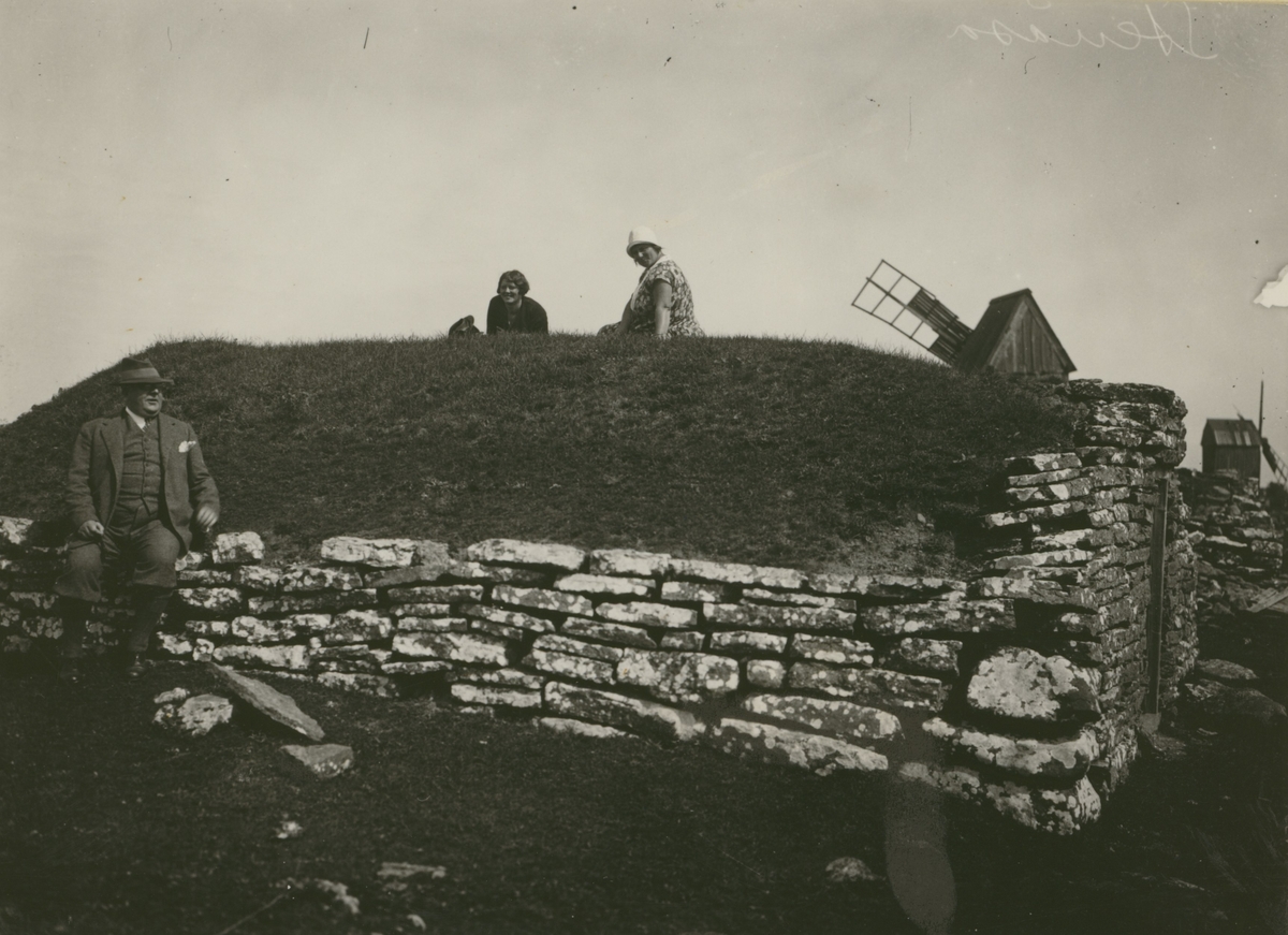 En jordkällare med torvtak och stubbkvarnar i Frösslunda.