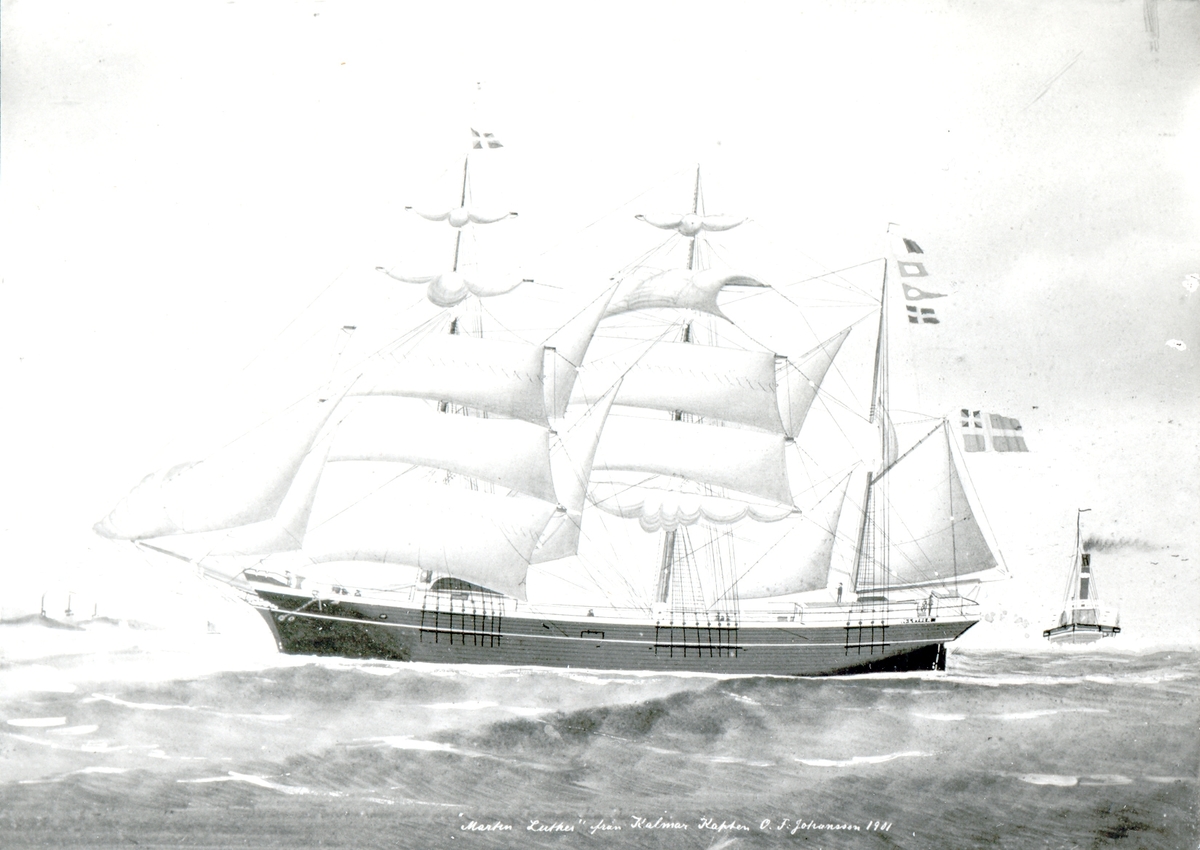 En målning av barken "Martin Luther" och ett ångfartyg.