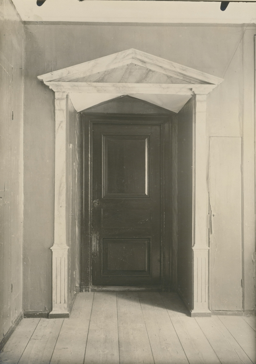 Knapegården. "Huvudbyggningen: övre våningen, dörromfattning i förstugan."