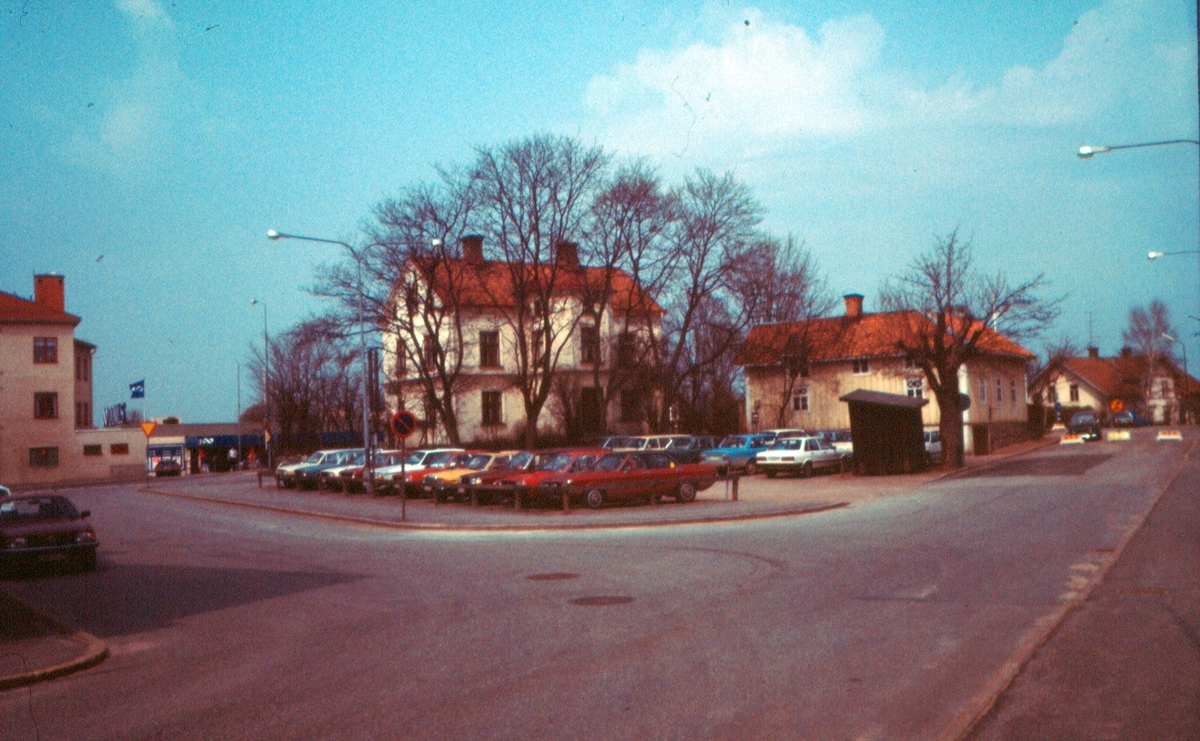 En gatukorsning med parkeringsplats och bostadshus. Kampgatan i Vimmerby.