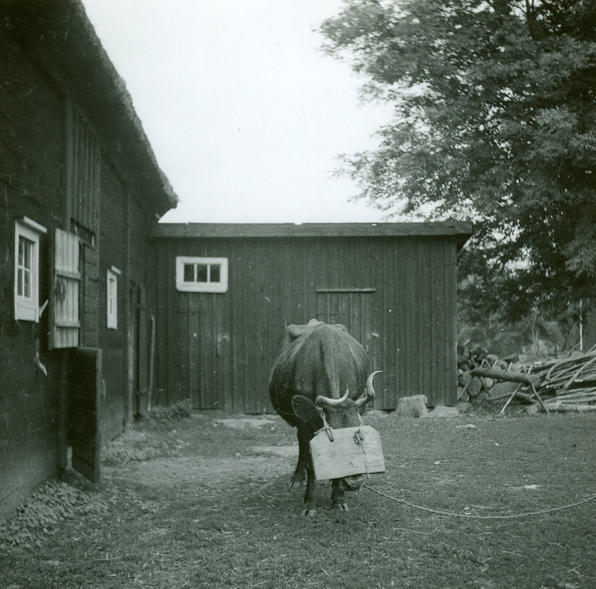 En så kallad "kofjöl" för kor som vill hoppa över gärdsgårdarna. Kofjölens mått: 38 x 25 centimeter.