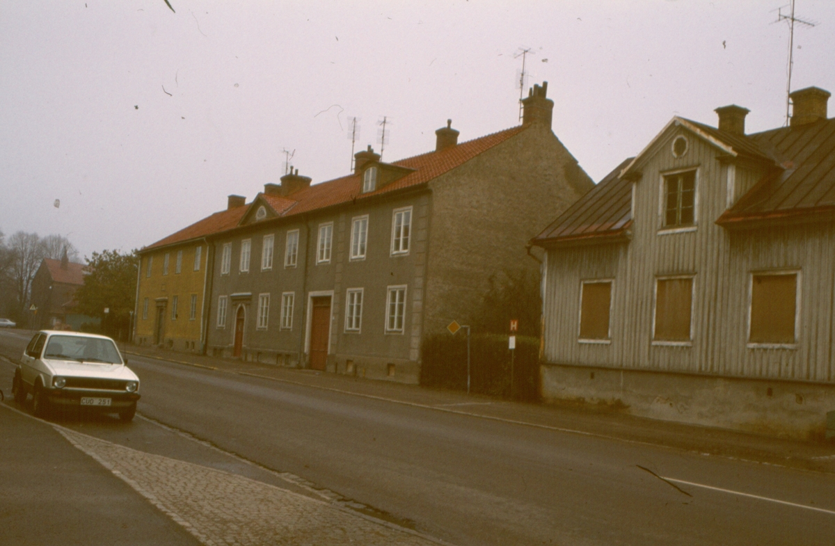 Bostadshus med putsad fasad, sadeltak och skorstenar.