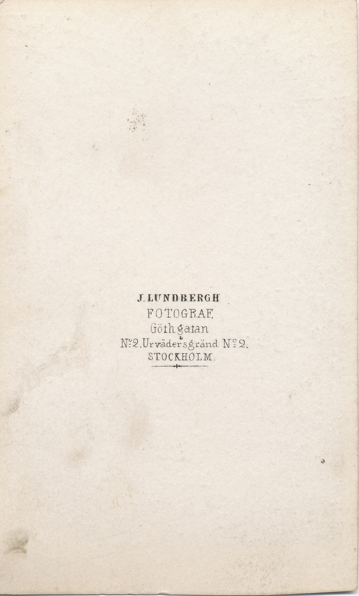 Tryckt text på visitkortets baksida: "J Lundbergh FOTOGRAF. Göthgatan No 2 Urvädersgränd No 2. STOCKHOLM."