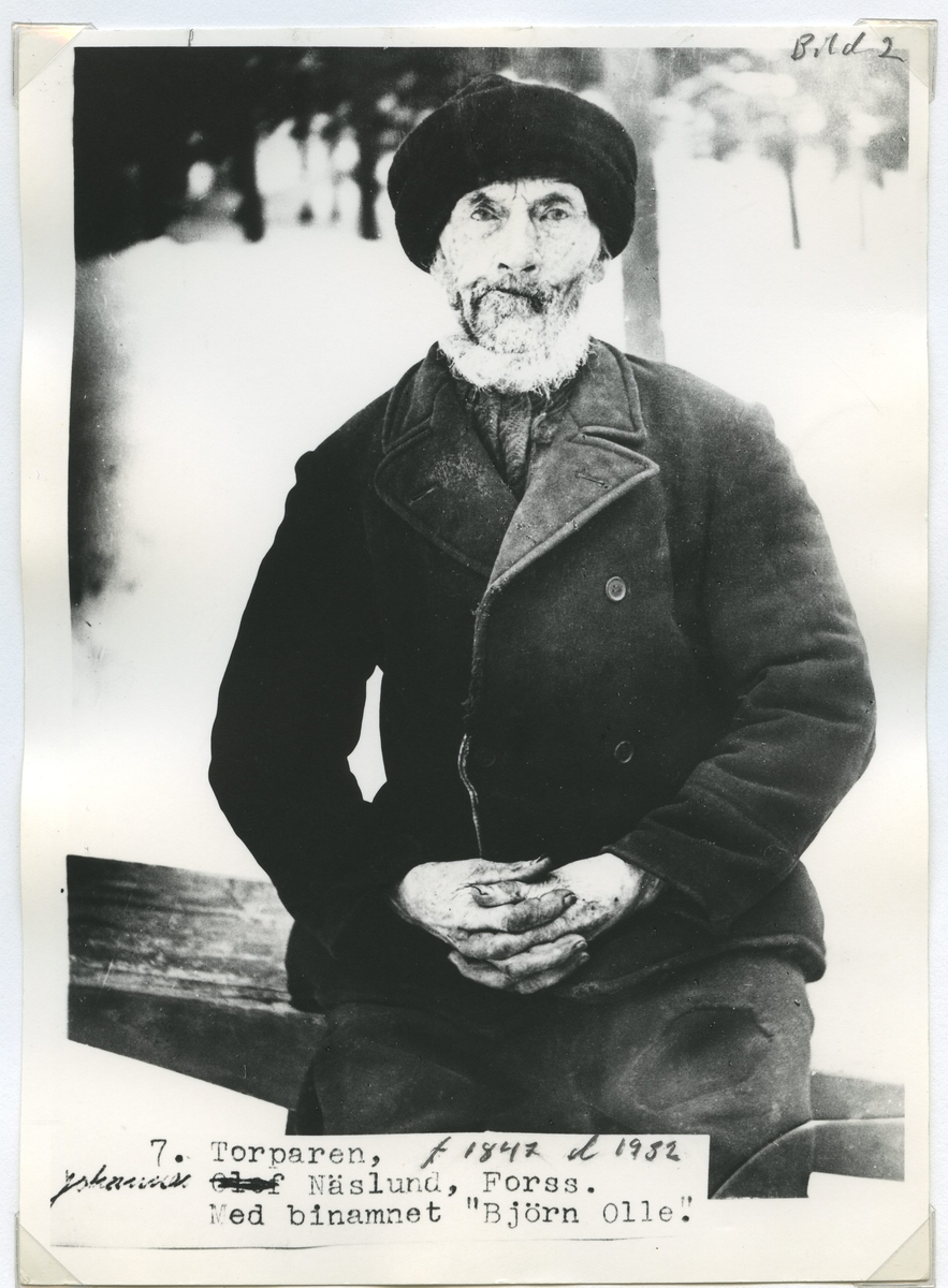 Titel: Torparen Näslund, Forss. Med binamnet "Björn Olle". Bodde i Nästra församling söder om Örnsköldsvik.