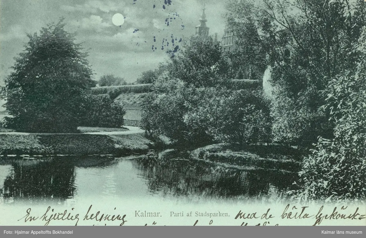 Titel: Parti av Stadsparken i Kalmar, en damm. Handskriven text: "En hjärtlig helsing med de bästa lyckönskningar sändes från Mathilda."