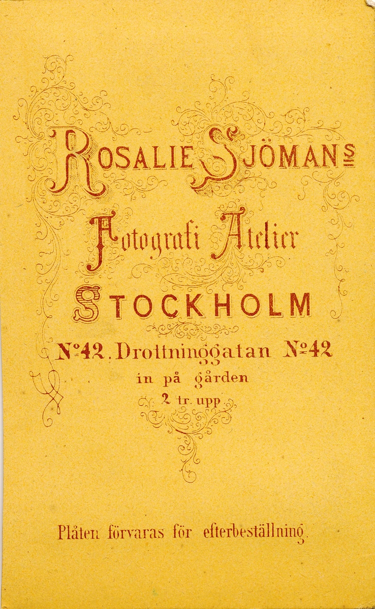 Tryckt text på visitkortets baksida: "Rosalie Sjömans Fotografi Atelier Stockholm No 42 Drottninggatan No 42 in på gården 2 tr. upp"