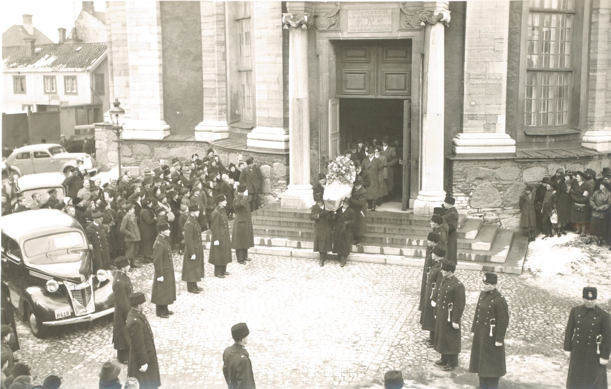 Titel: Anders Lindegrens begravning i Kalmar domkyrka i 1940. Lindegren stupade den 13 mars 1940 i Finland. Anders Lindegren var son till boktryckare Sven Lindegren, Kalmar. Gravsättningen ägde rum på Norra Kyrkogården.