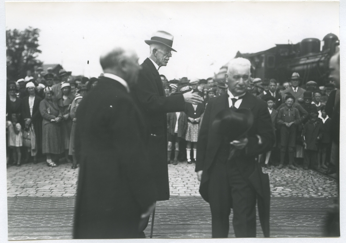Gustav V vid Ölandskajen (Ölandshamnen). Från vänster konsul John Jeansson, Gustav V och landshövding John Falk.