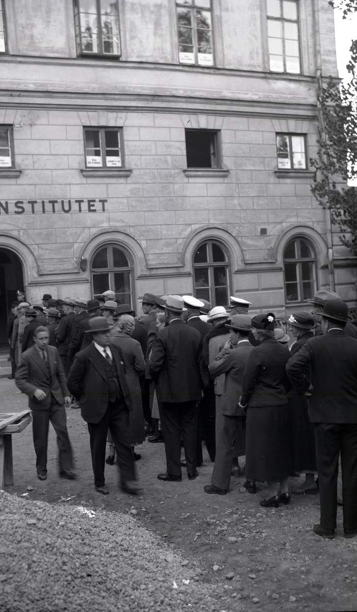 Valdagen 1936. Kö av röstande på Handelsinstitutets gård.