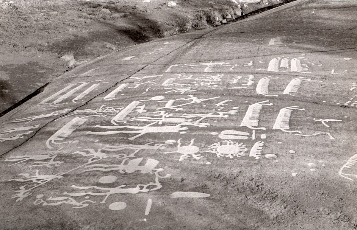 Fartyg och människor mm som hällristningar. Hällristningsområdet i Tanum är ett område i Tanums kommun i Bohuslän där man funnit flera berghällar med stora mängder hällristningar från bronsåldern. Runt den största av dem, Vitlyckehällen, är Vitlycke museum uppbyggt. Hällen har närmare 300 inhuggna figurer och ca 170 skålgropar. Den kanske mest berömda scenen bland alla Tanums hällristningar, "Brudparet", finns här. Bland de övriga närliggande hällarna märks Litsleby med en ca 2,3 meter lång spjutbeväpnad man, "Spjutguden", och Aspeberget med en plöjningsscen, ett antal oxar och skepp. Hällen vid Fossum ligger en bit från de övriga. Den kännetecknas av en mer sammanhållen och konstnärlig komposition. Kanske är den gjord av en enda ristare.