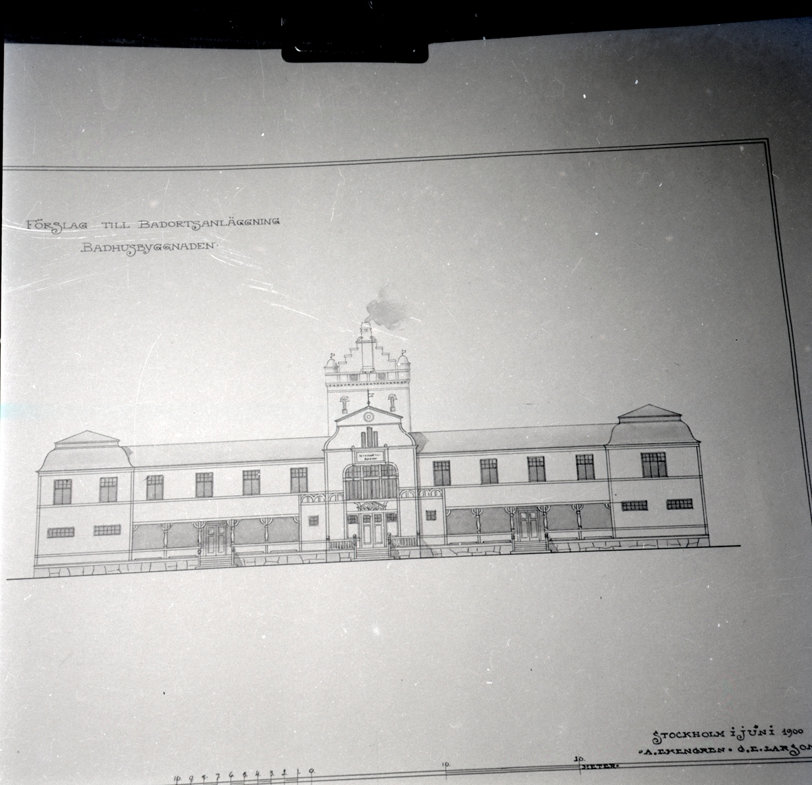 Förslag till badortsanläggning på Öland. Skiss av tänkt badhusbyggnad.