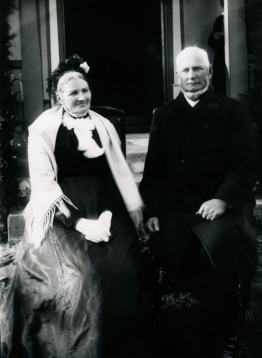 Ett äldre par i finkläder, sittande framför husets yttertrappa.
