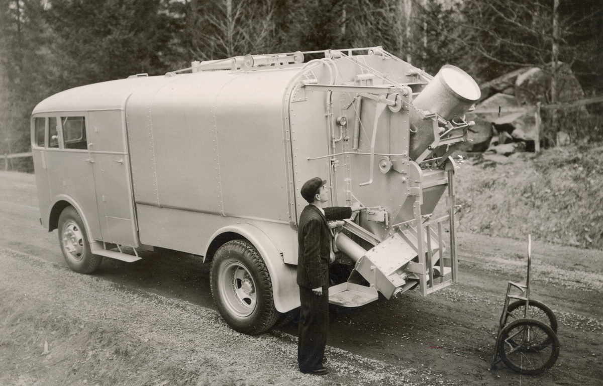 Sopvagn för dammfri tömning, automatisk kärllyftare och tömningsanordning. Cirka 1949.
