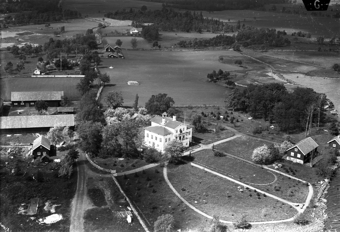 Flygfoto över varvet i Kolboda, med chefsbostaden i centrum av bilden.