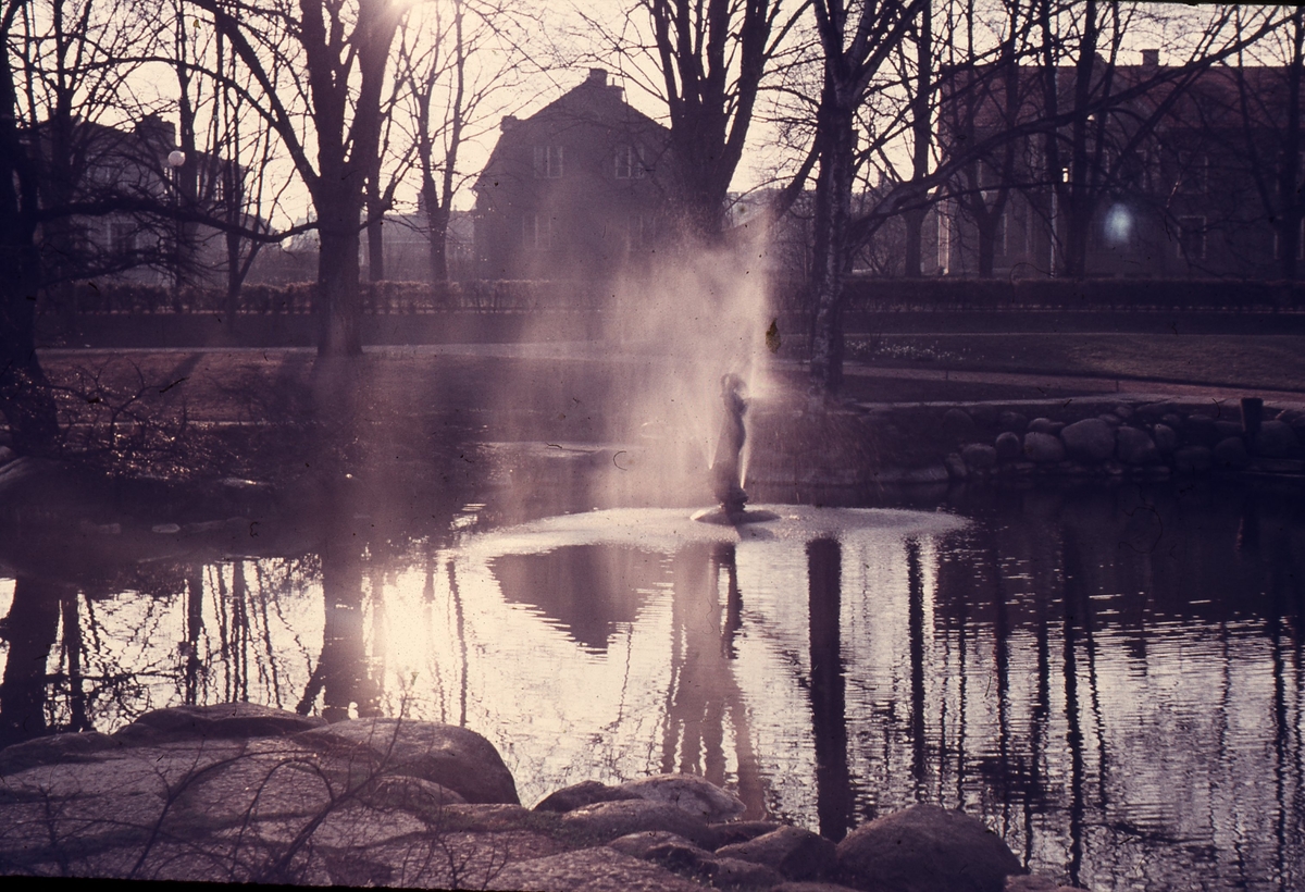 Dammen i Kalmar stadspark med fontän i form av en sjöjungfru.