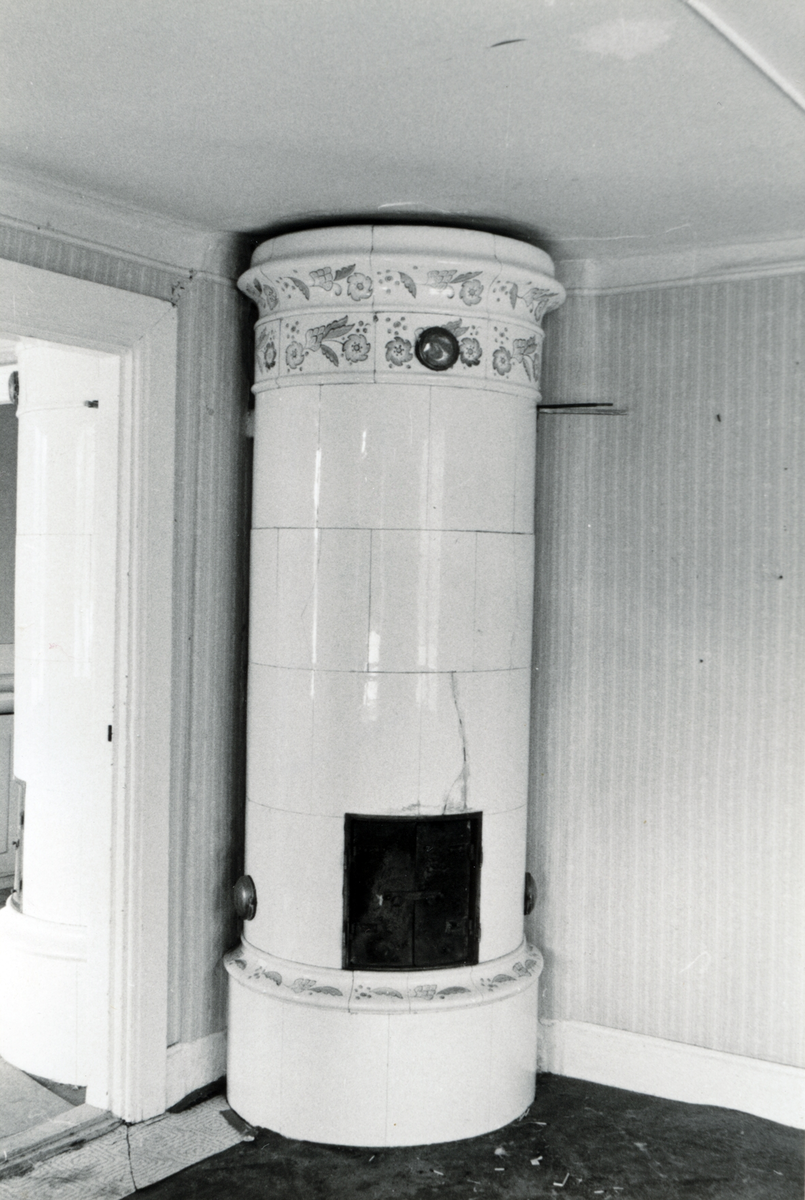 Kakelugn i brunt, blått och gult på nedre botten i en fastighet. Huset revs 1971.