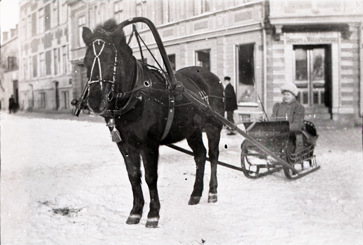 Fröken Betty le Grand sitter i släden i hörnet av Smålandsgatan - Fabriksgatan, Kalmar.