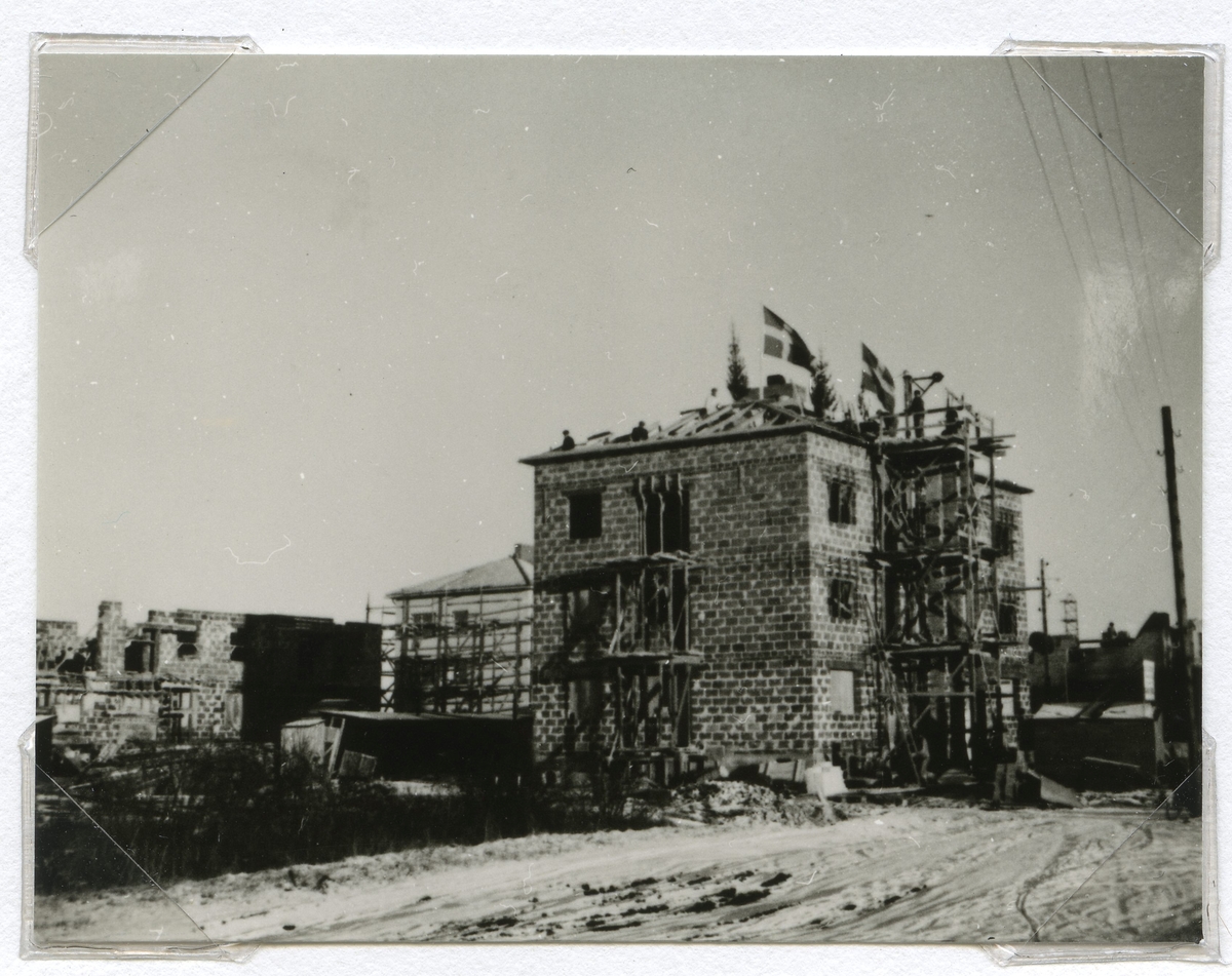 Taklagsfest med granar istället för kransar på Norrgårdsgärdet, Malmen, Kalmar. Dec 1947.