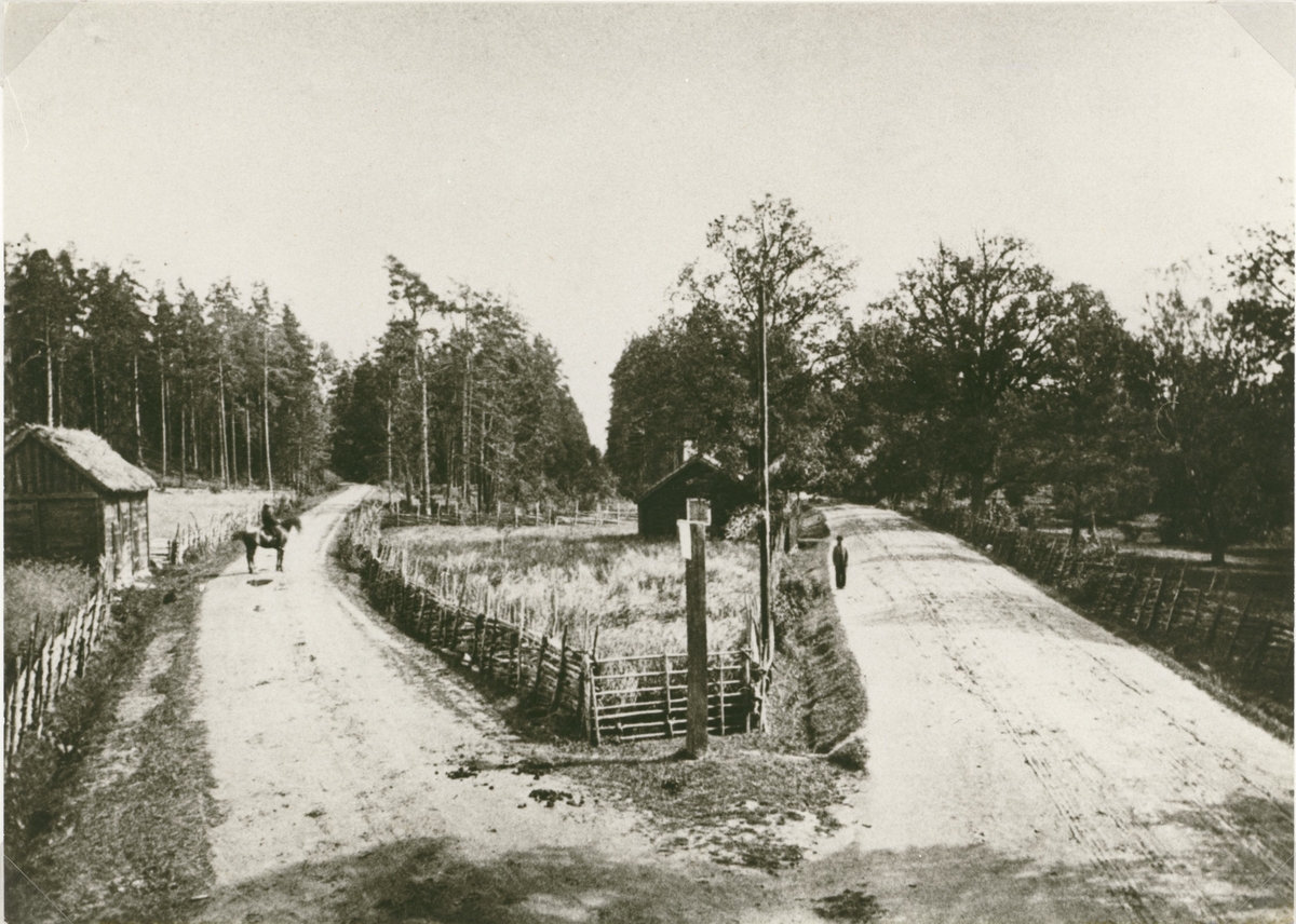 Foto c:a 1880. Till höger Kalmarvägen, till vänster Smedbyvägen. Vägar med gärdsgård.