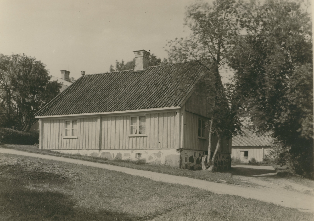 Flyglarna på Valstads gård, vita timmerhus med höga sadeltak.