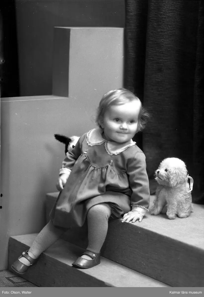Ateljéfoto. Liten flicka med två leksaksdjur.