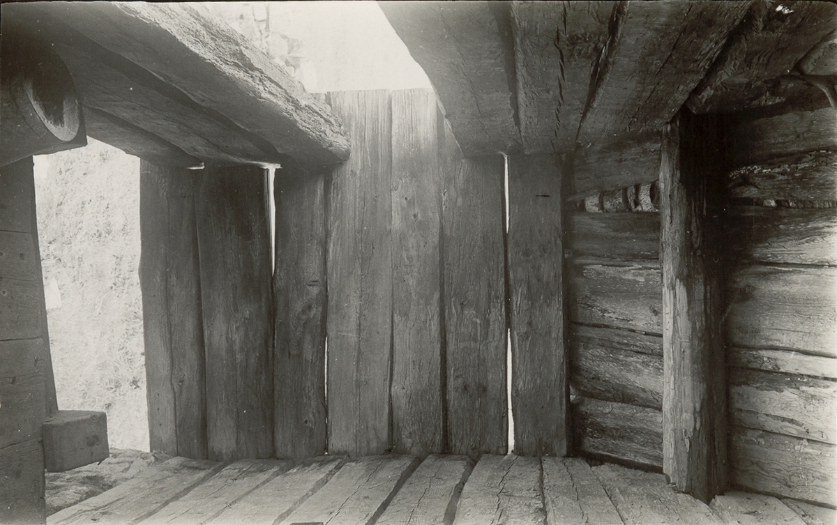 Källarbod. Interiör mot svalgången mot öster, där trappan mynnar. Upp. Takläggningen. Ned. Svalgångens golv. Längd på boden 6,50 m. Bredd 5,00 m. Ägare: Holmqvists sterbhus.