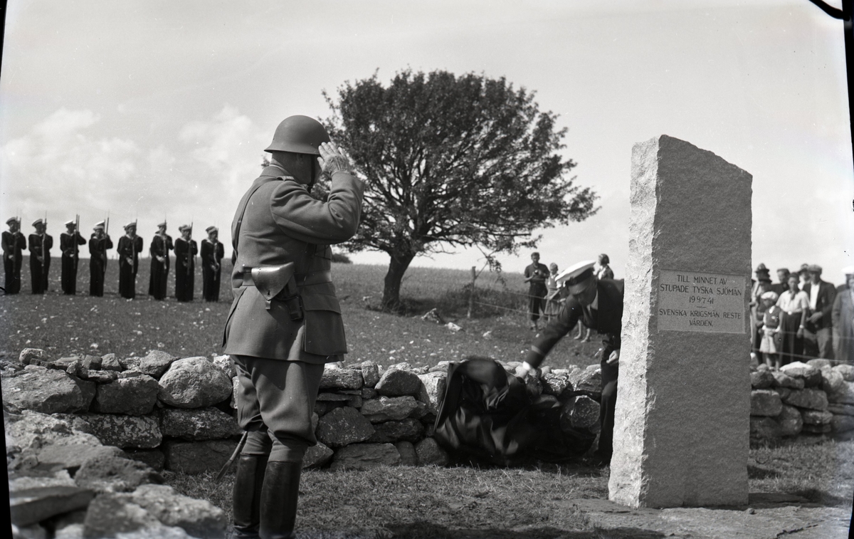 Ceremoni vid minnesstenen för de tyska sjömän som omkom i minkatastrofen i Gräsgård 1941. Soldaten på bilden är svensk.