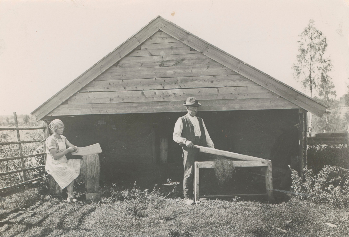 Häckling och skäktning av linet vid en bastu i Yggesbo.