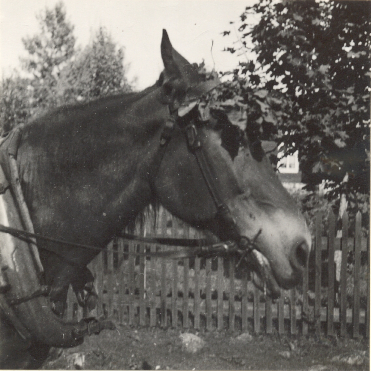 Karl Emil Wingren, häst med lövkrans för undvikande av solsting och för att skydda ögonen mot flugor.
