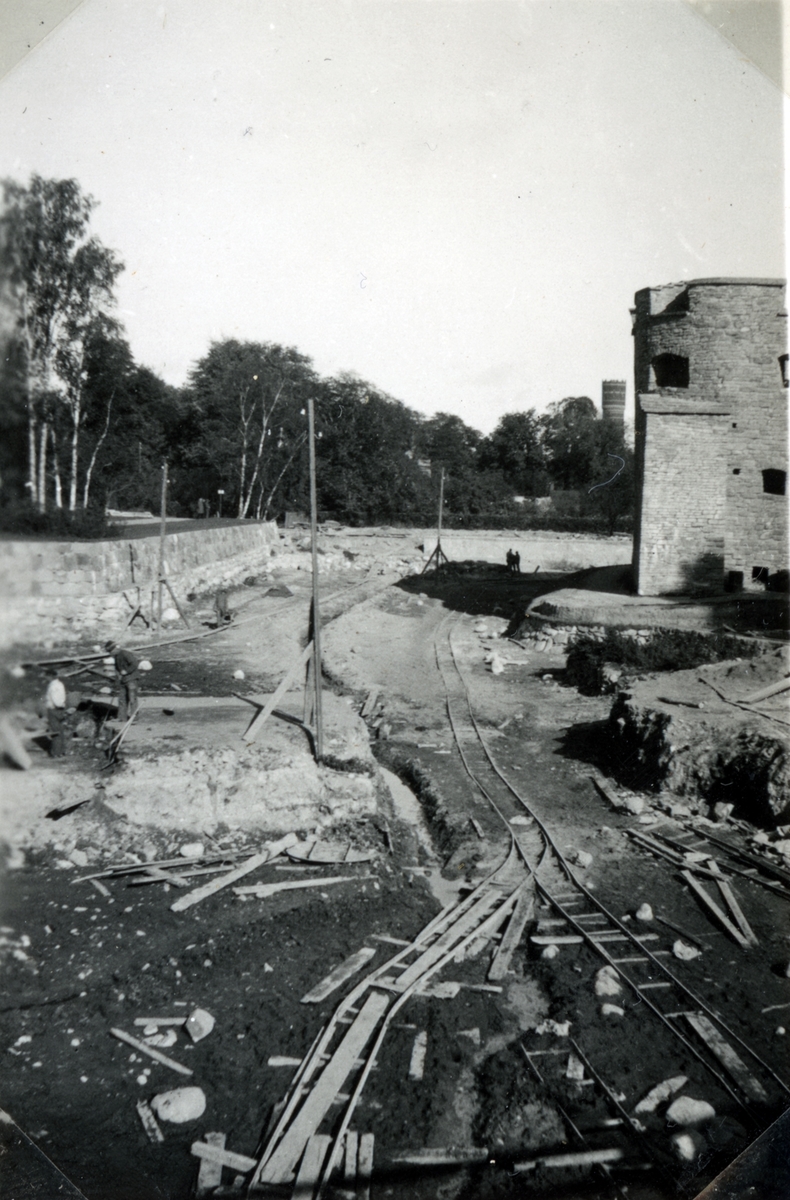 Utgrävning vid vallgraven till Kalmar slott under utgrävningarna 1932-1934. Efter detta vattenfylldes graven som dessförinnan varit torrgrav.