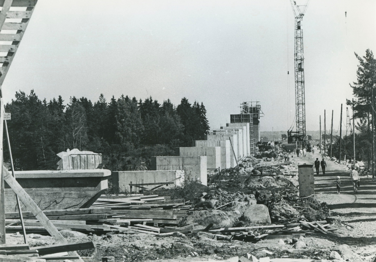 Vy från byggandet av Ölandsbron. Själva brobanan gjuts under tak i den gjutvagn som matades mellan pelarna.