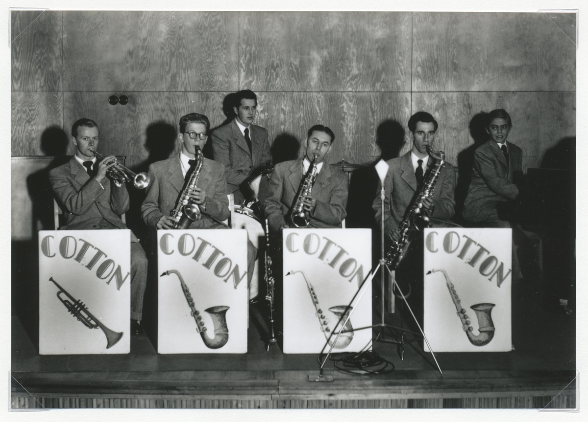 Cotton, från vänster: Göte Franzén - trumpet, Rune Falk - altsax, Sture Berglund - trummor, Per-Olof Nilsson - altsax - klarinett, Kalle Carlswärd - tenorsax, Jan Andrén - piano.