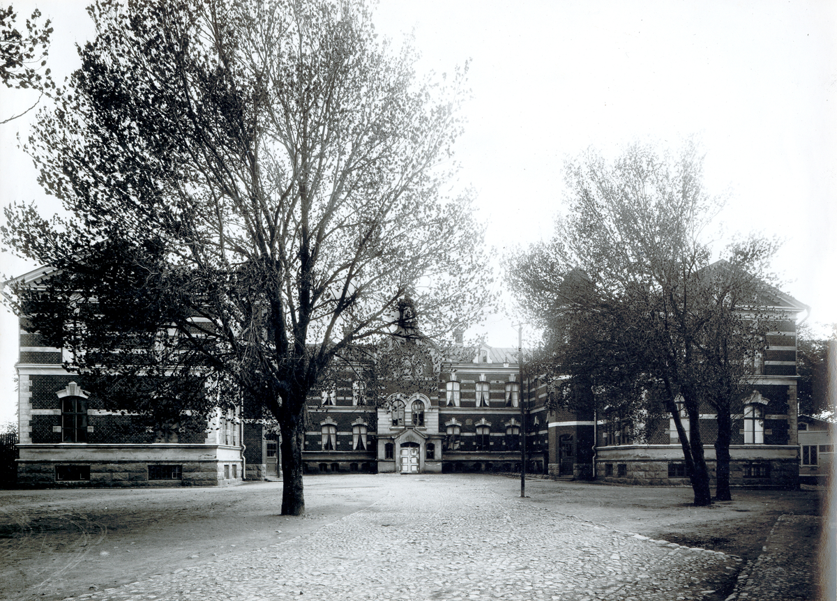 Ålderdomshemmet Falkenbergs baksida, som egentligen skulle varit framsidan, med stensättning av kullersten. Huset är numera ombyggt till studentlägenheter.