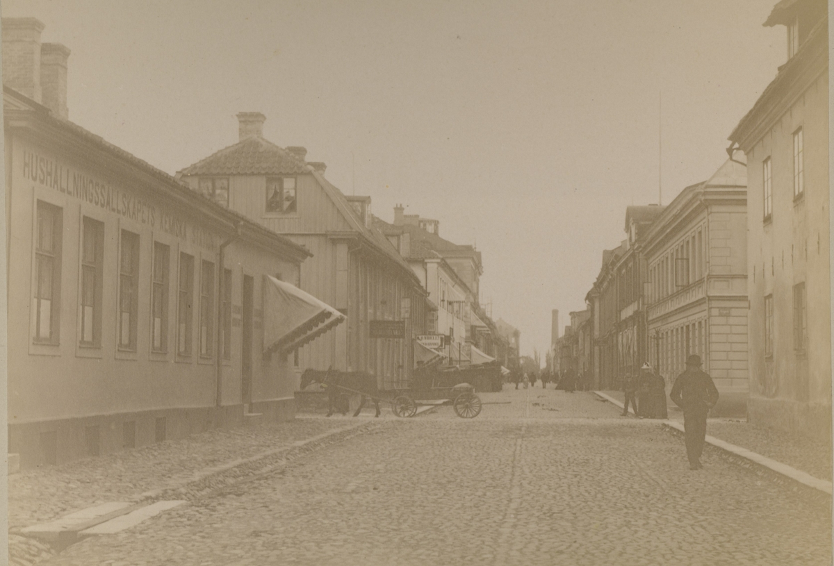 Gatuvy från Södra Långgatan i korsningen med Larmgatan. Närmast till vänster i bild syns Hushållningssällskapets kemiska station som startades 1877. Människor promenerar längs gatan och ett hästekipage syns till vänster.