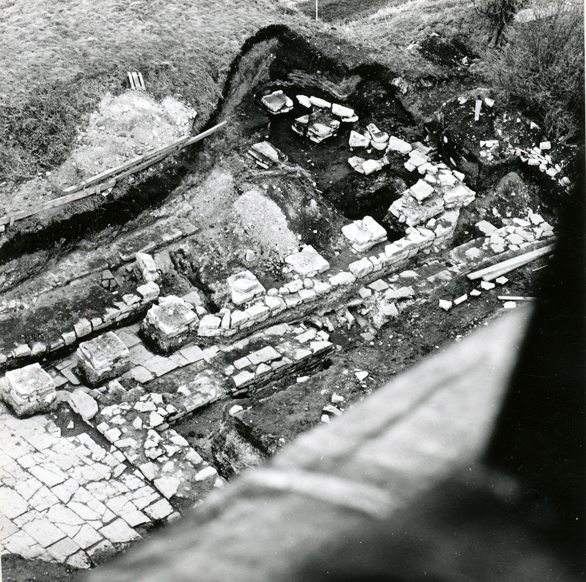 Utgrävning på Kalmar slott, översiktsbild av området väster om västra muren, sett från Kuretornet.