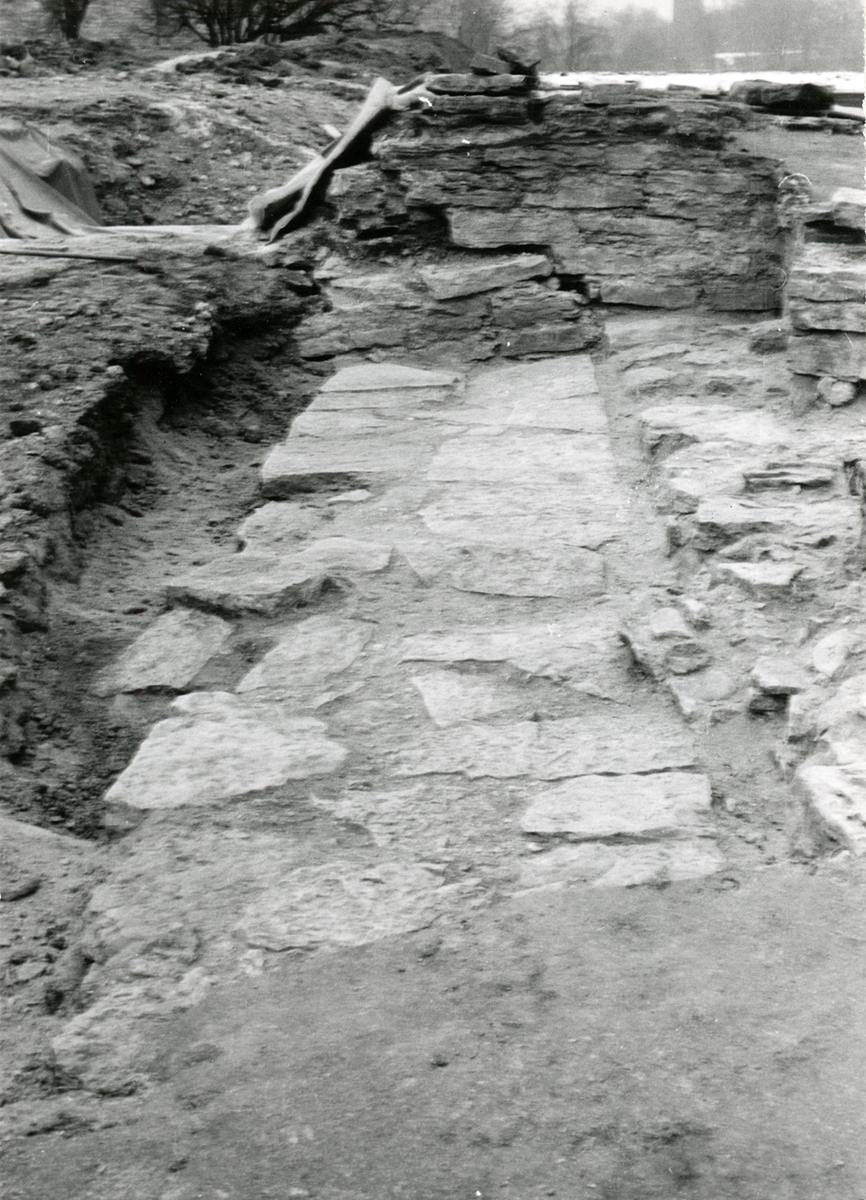 Utgrävning på Kalmar slott. Den äldre muren sedd mot norr. Rapporten: Krutkammaren, vallgraven, västra vallen och brunnar.