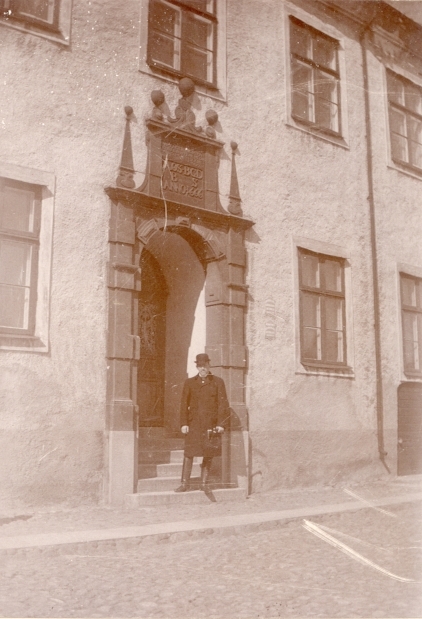 En man i portalen till Dahmska huset vid Lilla Torget.