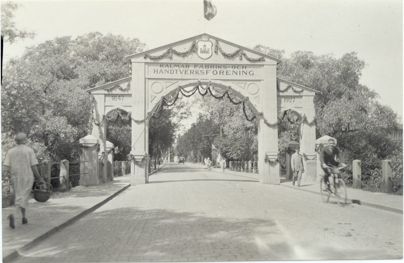 Triumfbåge byggd på Tullbron till Kalmar fabriks och hantverksförenings jubileum 1847-1927.