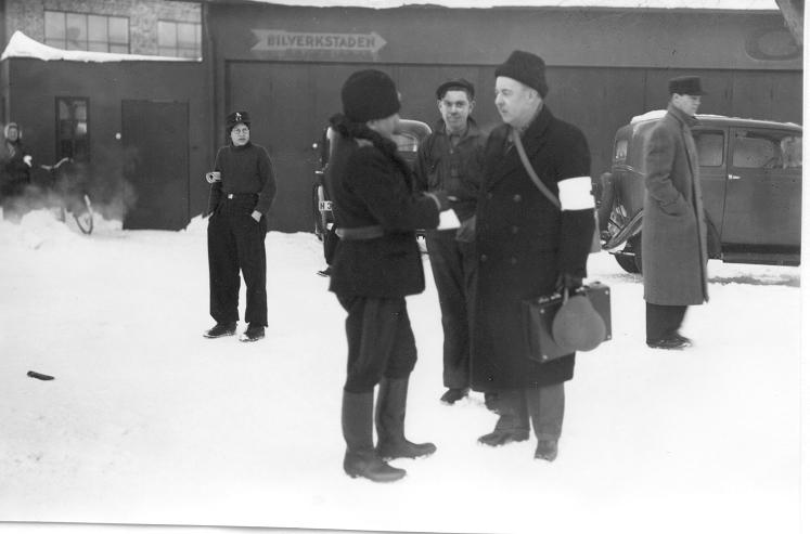 Brandchef Florin i samspråk med dr Yngve Wigh vid Röda korsets civilförsvarsövning.